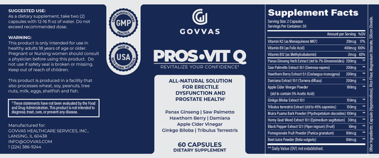 Pro-Vit Q is a natural supplement for prostate health and erectile dysfunction. It supports urinary flow, reduces BPH symptoms, and enhances sexual performance with ingredients like saw palmetto, zinc, Hawthorn berry extract and panax ginseng.